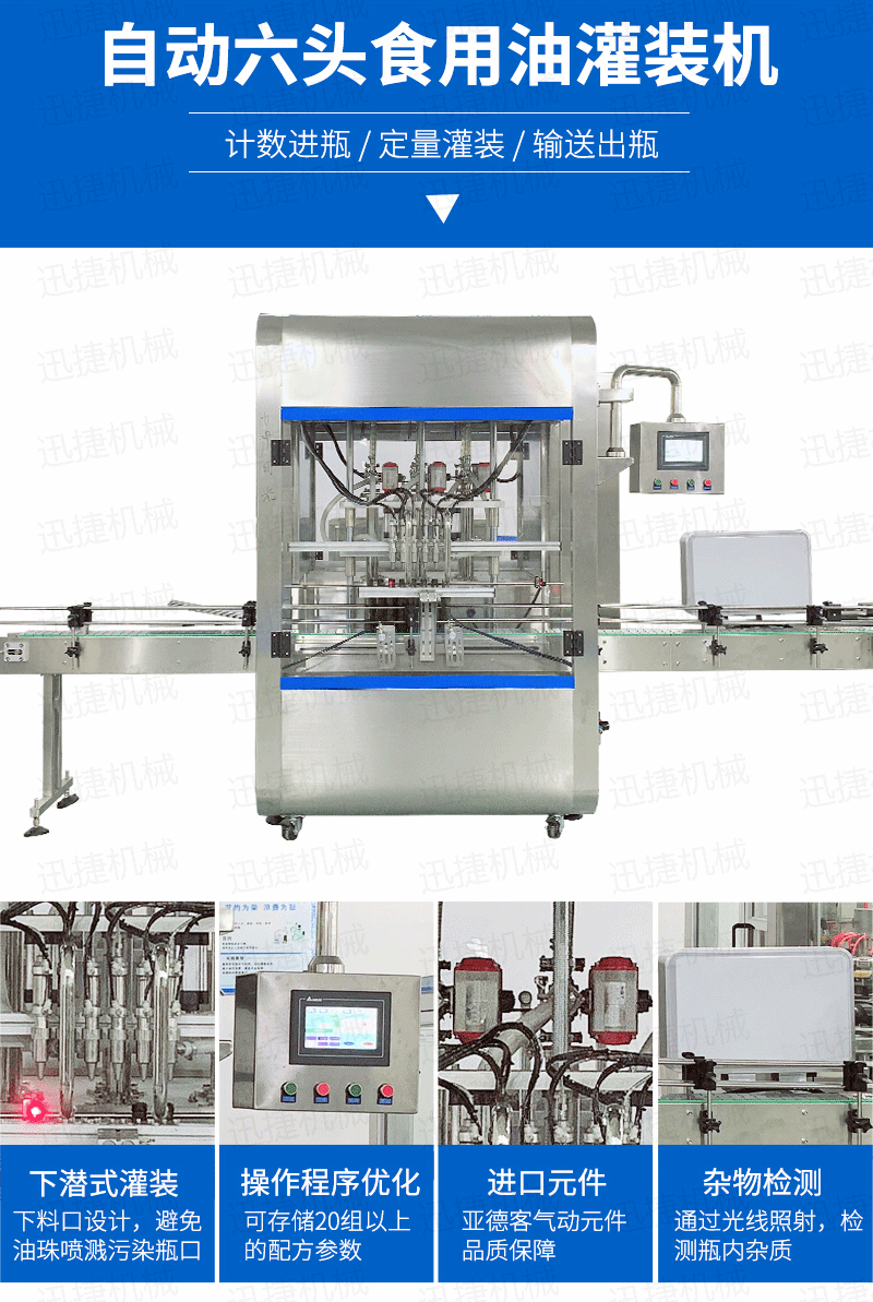 該系列灌裝機采用伺服柱塞式計量灌裝原理,適用于各種規格(0.1-1升可兼顧到2升灌裝)的南瓜籽油、榛子油、牡丹籽油、芝麻油、核桃油、山茶油、亞麻籽油、棉籽油、橄欖油、大豆油、玉米油、菜籽油等食用油灌裝。設備采用伺服系統定量推料,在人機界面數字化調節計量,并且可設定100ml或200ml等所需計量,觸摸屏一觸即達,而且可以單頭微調計量。操作簡單,維護方便,節省人工成本,生產效率更高。
